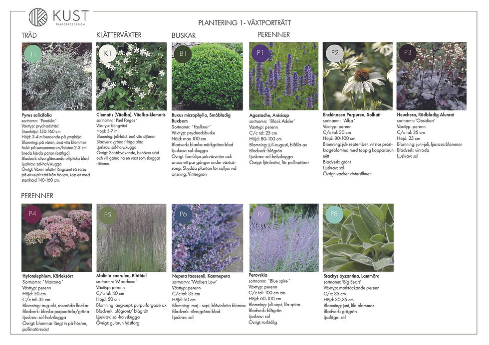 Du får en detaljerad planteringsplan för respektive rabatt, med växtkombinationer anpassade till platsens jordmån, läge och ljusförhållande. Ritningen visar var varje sort ska placeras. Du får en tillhörande växtlista över samtliga växter som omfattas av designförslaget. Växterna presenteras med bilder och beskrivande texter samt skötselanvisningar. Växtlistan redovisar art, sort, c/c-avstånd, kvalitet och antal. Det blir ett tydligt underlag vid inhandling av växter och att följa vid utplanteringen av växterna. Pris: fr. 3 000 kr